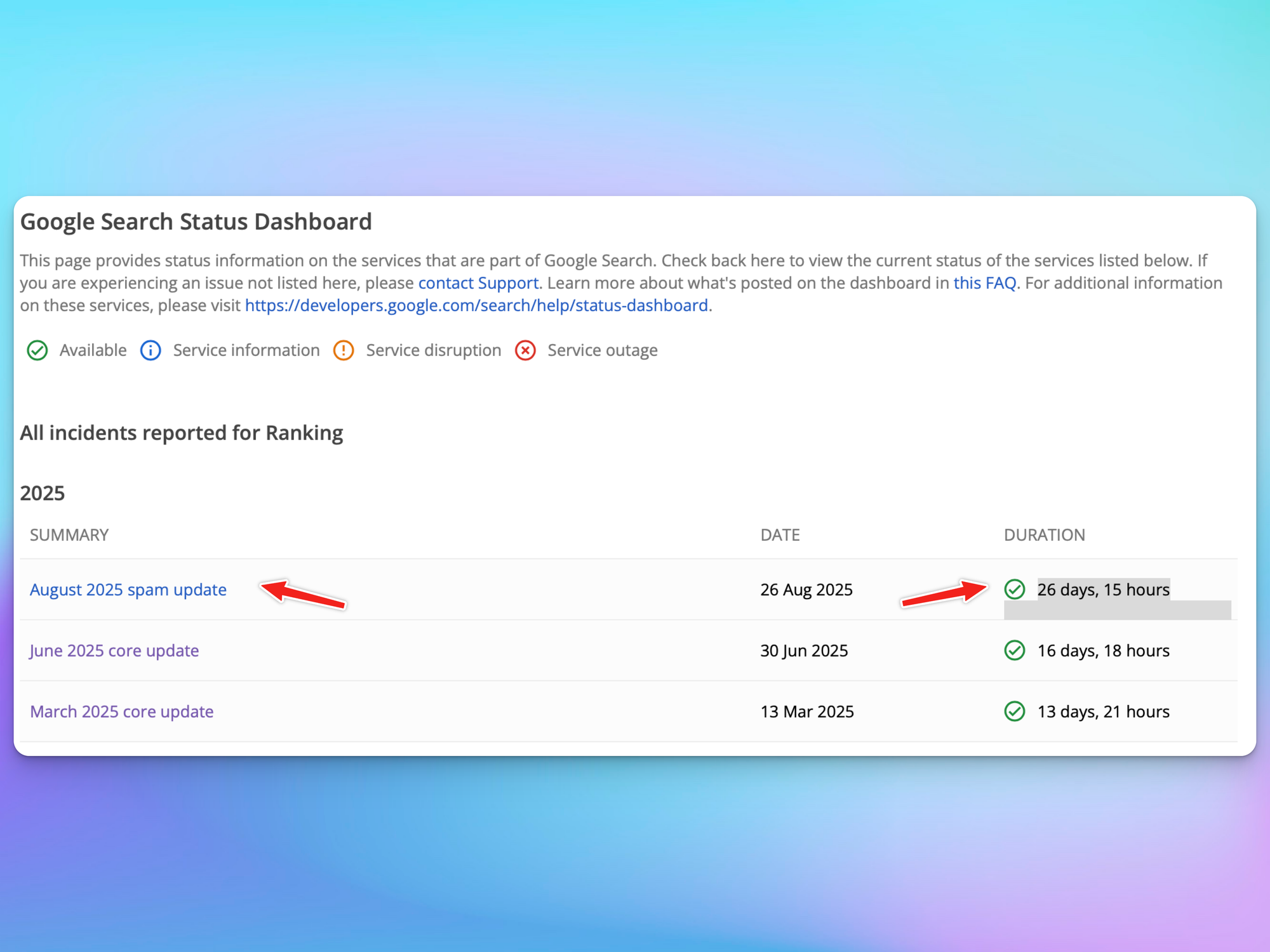 Google's August 2025 spam update began rolling out on August 26, 2025, and was completed on September 22, 2025, spanning a duration of 27 days. This was the first spam update of 2025 and the first since December 2024.