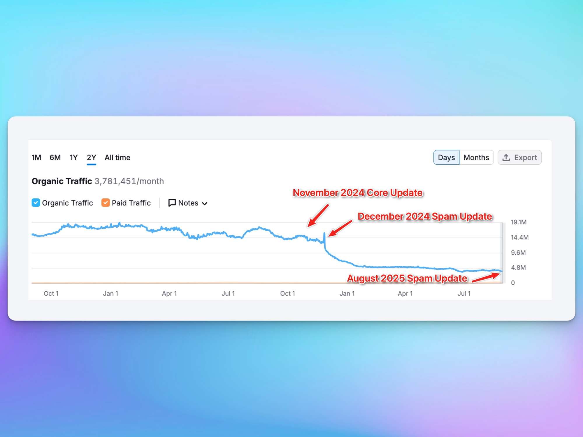 The screenshot shows HubSpot’s organic traffic performance after the 2024 and now 2025 spam updates.
