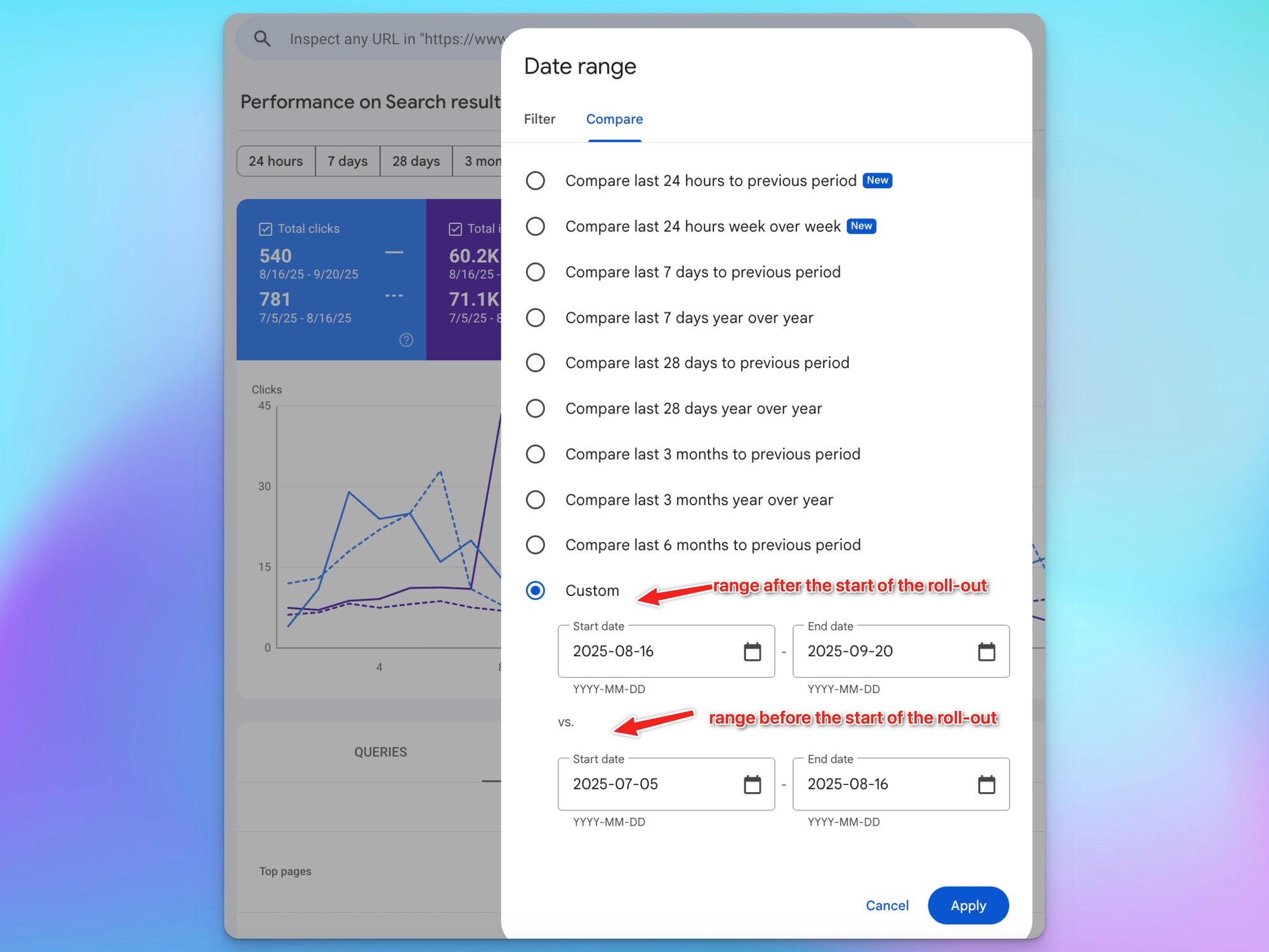 For the August 2025 spam update specifically, set your date range to include data from before August 26, 2025 (when the update began) through late September when it completed.