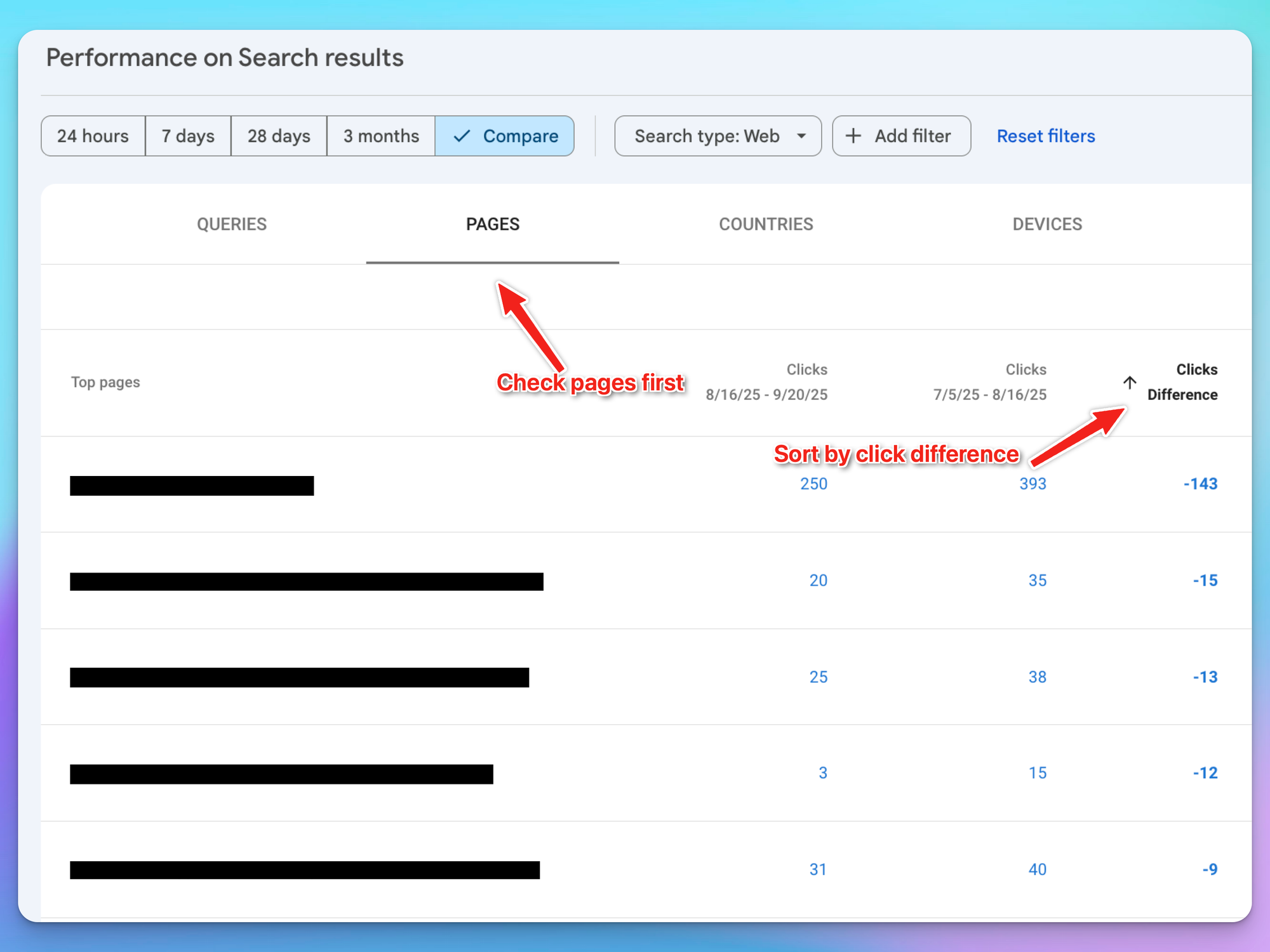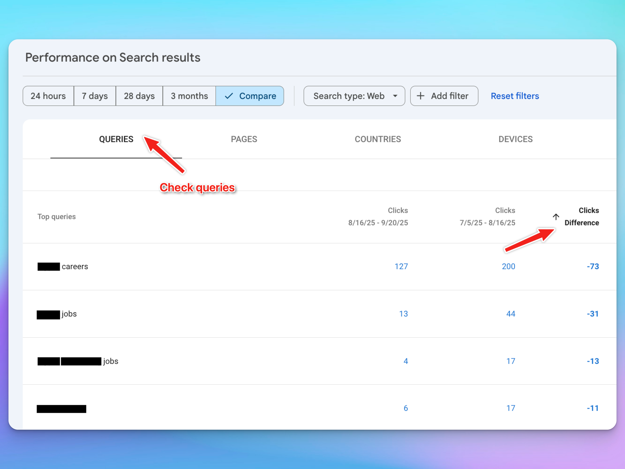 This can reveal other signs of what Google does not like; for example, if you started rolling out programmatic pages for salary reports and suddenly your keywords related to “salary product manager new york” have dropped to zero clicks.